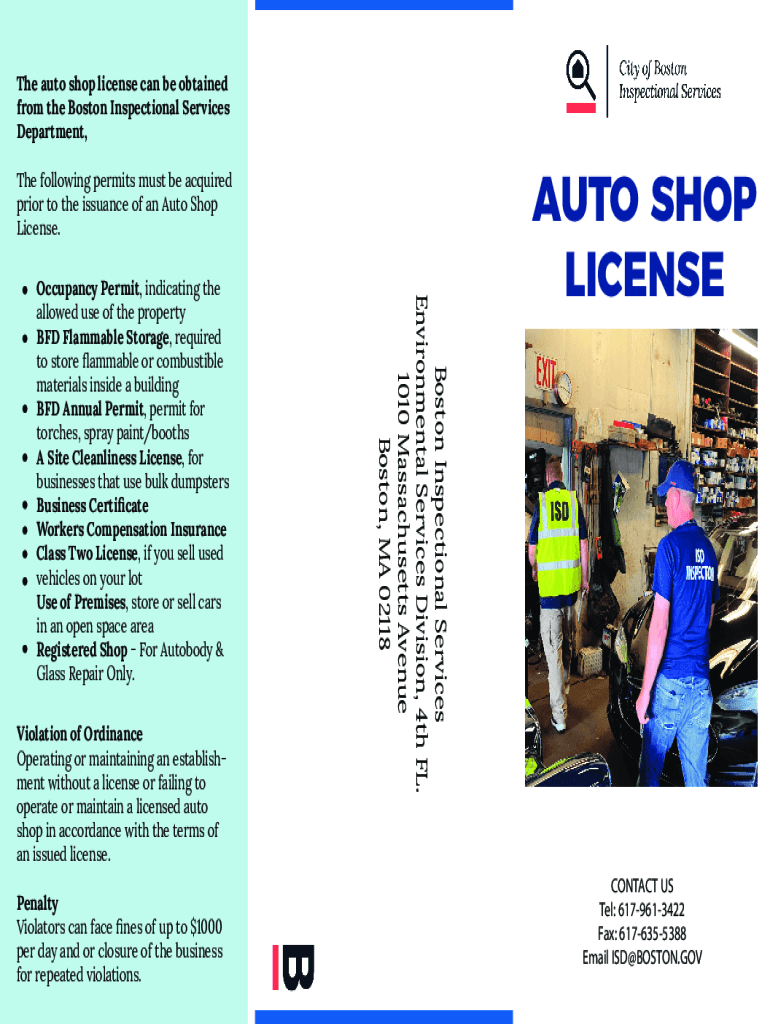 The auto shop license can be obtained from the Boston Inspection Services Department, The following permits must be acquired prior to the issuance of an Auto Shop License. Violation of Ordinance Operating