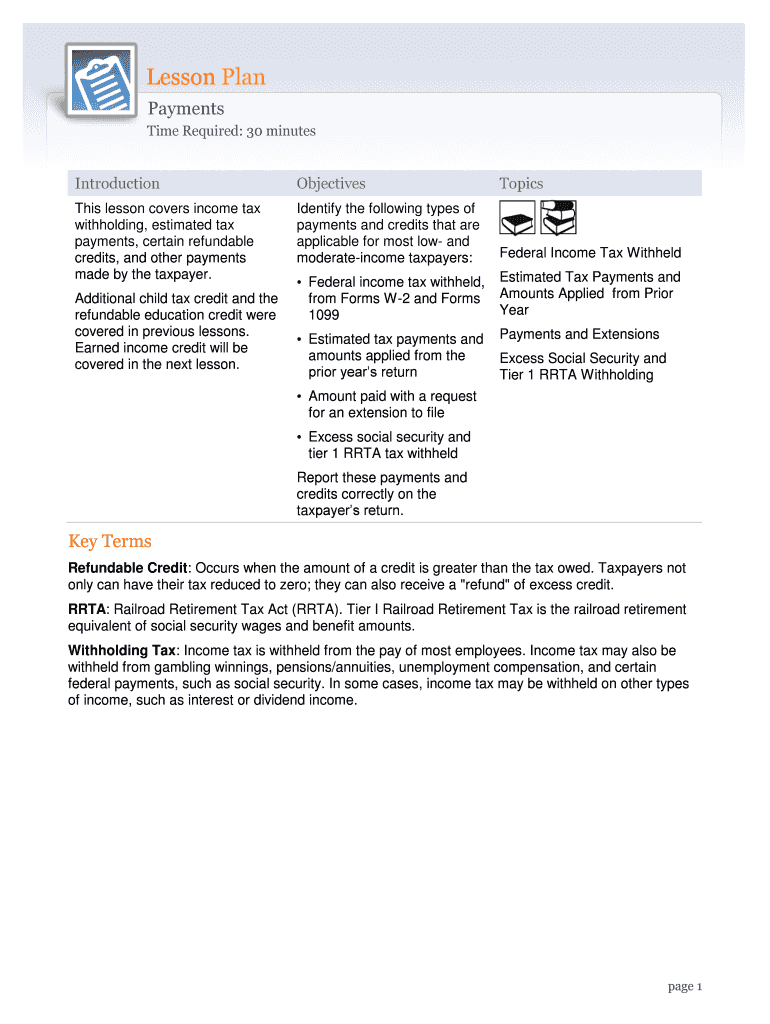 The US Federal Income Tax Withholding Lesson serves as an essential resource for understanding the intricacies of tax preparation. It is crafted for tax preparers and volunteers, aiming to equip them with crucial knowledge about income tax withholding, estimated tax payments, and applicable credits. Key concepts covered include the educational value of the lesson, which enhances the user's capacity to assist low- and moderate-income taxpayers in managing their tax responsibilities effectively.
