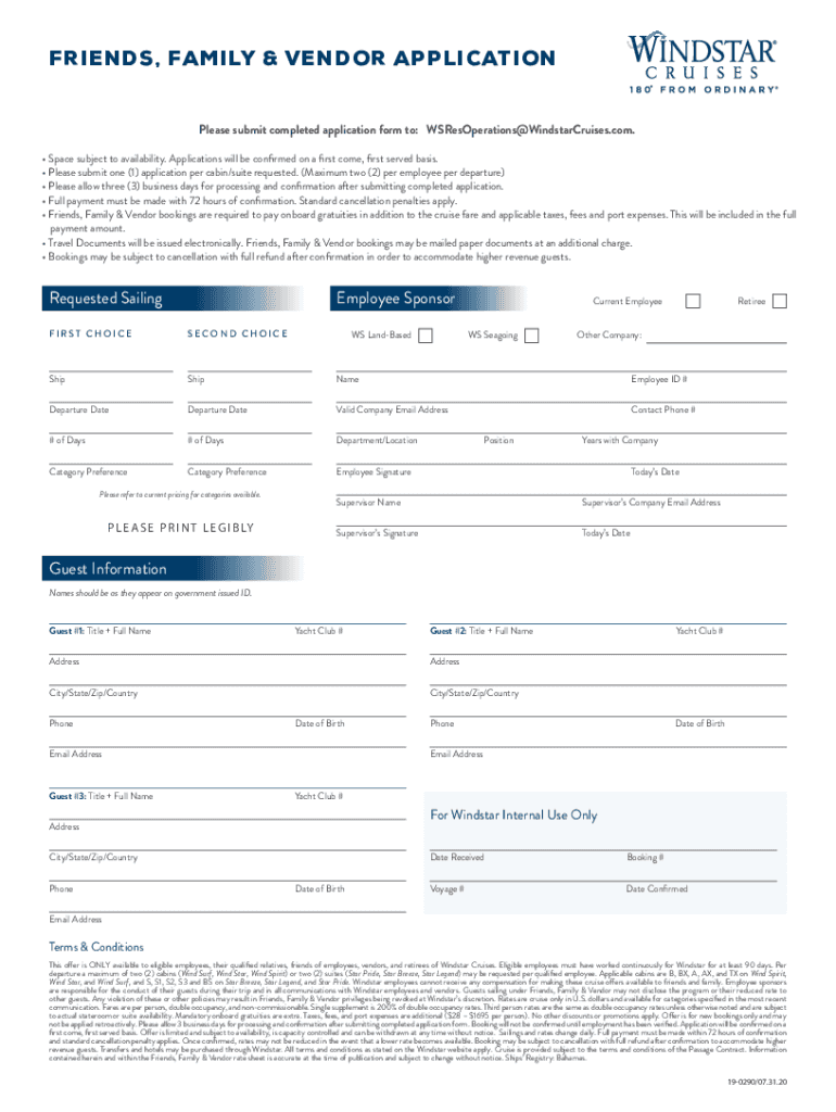 FRIENDS, FAMILY & VENDOR APPLICATION Please submit completed application form to: WSResOperations@WindstarCruises.com. Space subject to availability. Applications will be confirmed on a first come,