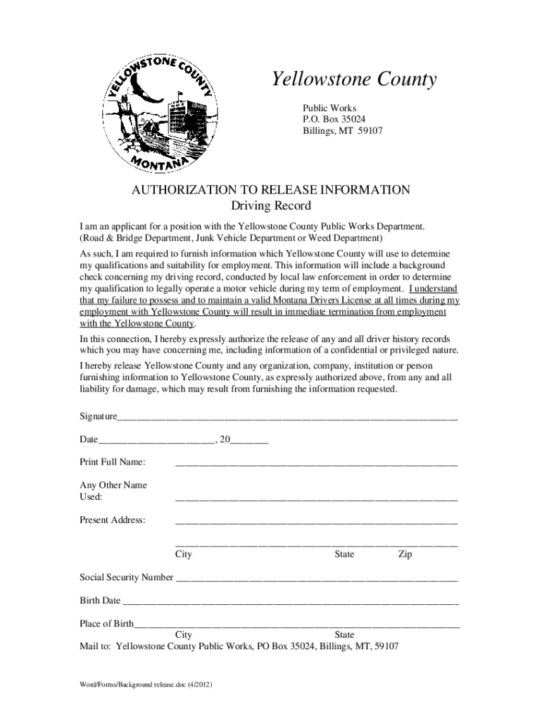 Yellowstone County Public Works P.O. Box 35024 Billings, MT 59107AUTHORIZATION TO RELEASE INFORMATION Driving Record I am an applicant for a position with the Yellowstone County Public Works Department.