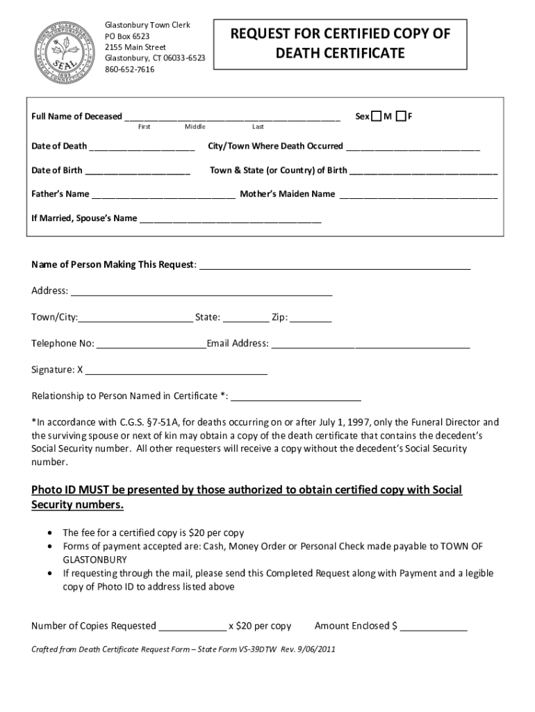 Glastonbury Town Clerk PO Box 6523 2155 Main Street Glastonbury, CT 060336523 8606527616REQUEST FOR CERTIFIED COPY OF DEATH CERTIFICATEFull Name of Deceased ___ FirstMiddleSex M Flatmate of Death