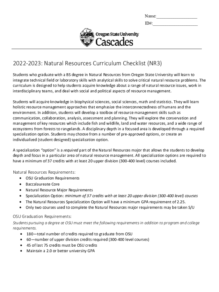 Name:___ ID#:___20222023: Natural Resources Curriculum Checklist (NR3) Students who graduate with a BS degree in Natural Resources from Oregon State University will learn to integrate technical field