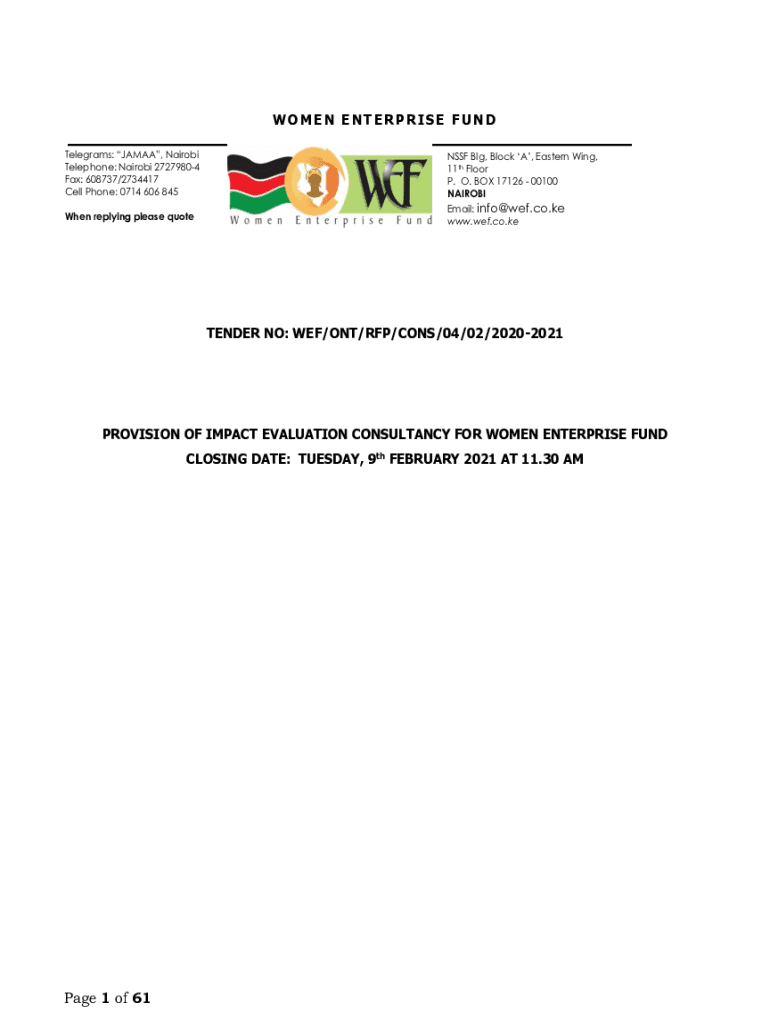 WOMEN ENTERPRISE FUND Telegrams: JAMAL, Nairobi Telephone: Nairobi 27279804 Fax: 608737/2734417 Cell Phone: 0714 606 845 When replying please quote BLG, Block A, Eastern Wing, 11th Floor P. O. BOX