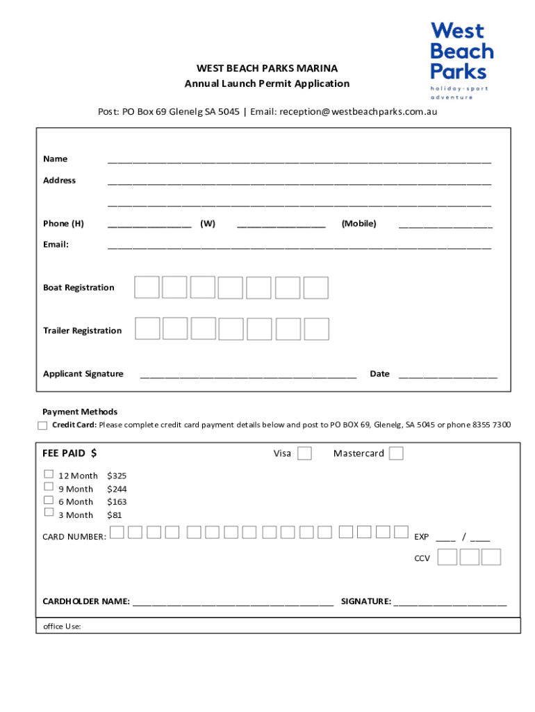 WEST BEACH PARKS MARINA Annual Launch Permit Application Post: PO Box 69 Level SA 5045 | Email: reception@westbeachparks.com.auName___Address___ ___Phone (H)___ (W)___(Mobile)___Email:___Boat RegistrationTrailer