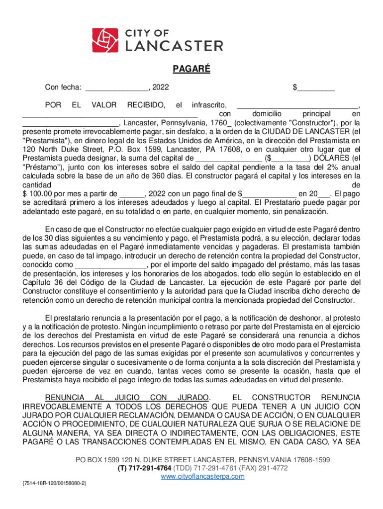 PAGAN Con tech: ___, $2022___POR EL VALOR RECITED, el infrascrito, ___, ___ con domicile principal en ___, Lancaster, Pennsylvania, 1760_ (colectivamente \” Constructor\”), POR la present promote