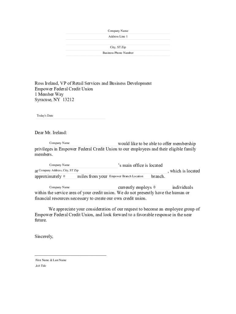 Company Name ___ Address Line 1 ___ ___ City, ST Zip ___ Business Phone Number ___Ross Ireland, VP of Retail Services and Business Development Empower Federal Credit Union 1 Member Way Syracuse, NY