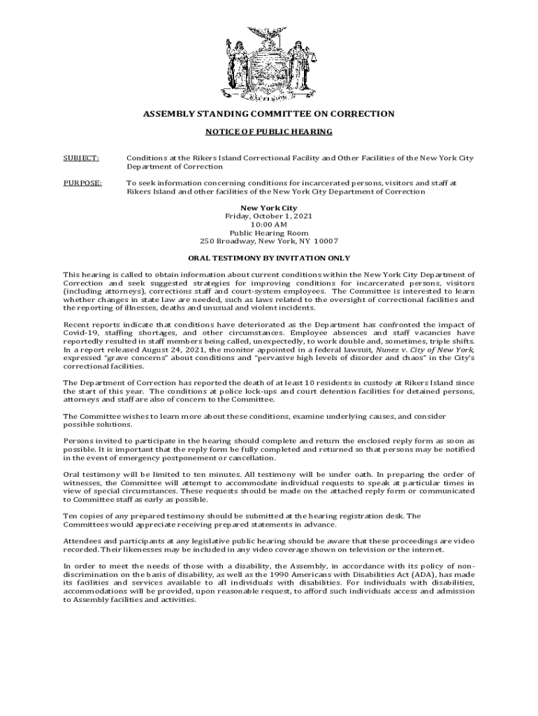 ASSEMBLY STANDING COMMITTEE ON CORRECTIONNOTICE OF PUBLIC HEARINGSUBJECT:PURPOSE:Conditions at the Rikers Island Correctional Facility and Other Facilities of the New York CityDepartment of Correction