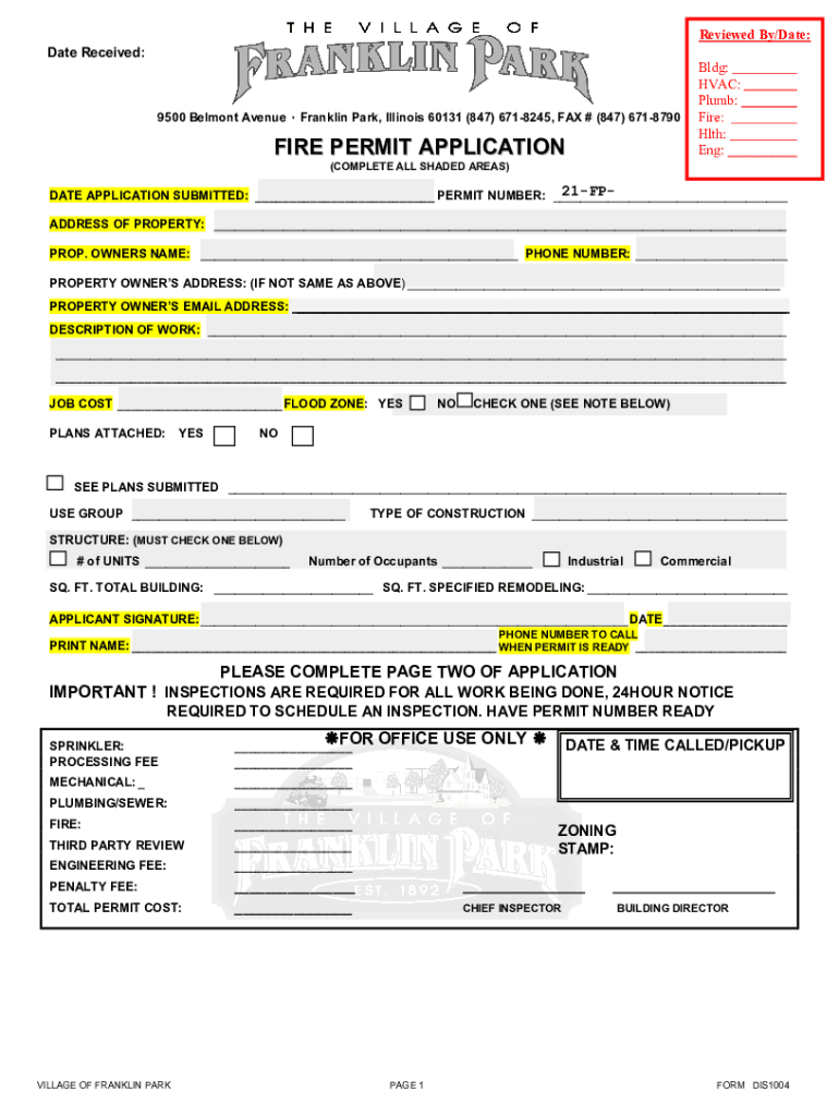 Reviewed By/Date: Date Received:9500 Belmont Avenue Franklin Park, Illinois 60131 (847) 6718245, FAX # (847) 6718790FIRE PERMIT APPLICATIONBldg: HVAC: Plumb: Fire: Hath: Eng:(COMPLETE ALL SHADED AREAS)21FPDATE