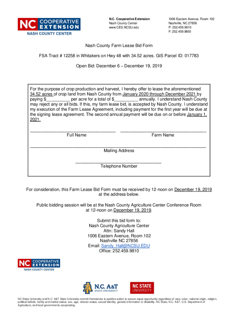 N.C. Cooperative Extension Nash County Center www.CES.NCSU.edu1006 Eastern Avenue, Room 102 Nashville, NC 27856 P: 252.459.9810 F: 252.459.9850Nash County Farm Lease Bid Form FSA Tract # 12258 in