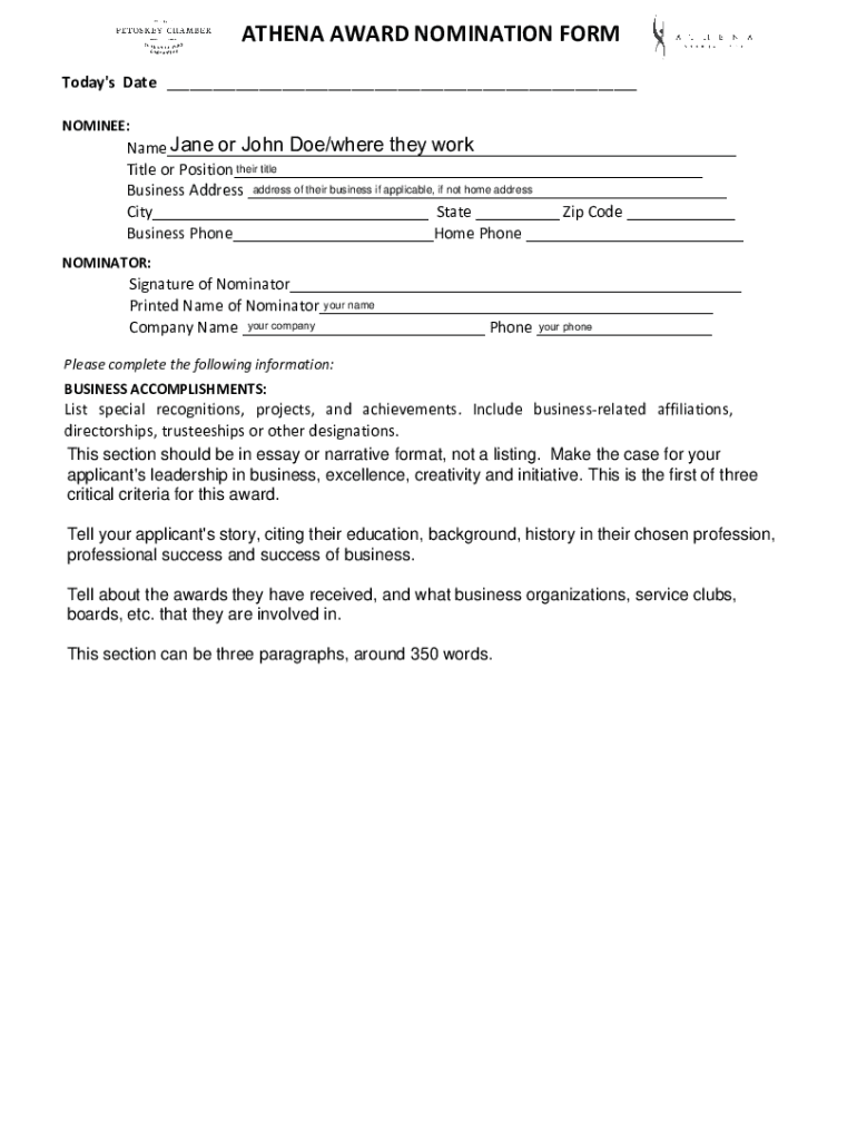 PESKY REGIONAL CHAMBER OF COMMERCE ATHENA AWARD NOMINATION FORM: Instructions The ATHENA Award Program celebrates the potential of all women as valued members and leaders of the community and recognizes
