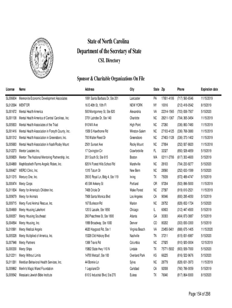 State of North Carolina Department of the Secretary of State CSL Directory Sponsor & Charitable Organizations On File LicenseNameAddressCityState ZipPhoneExpiration dateSL006604Mennonite Economic