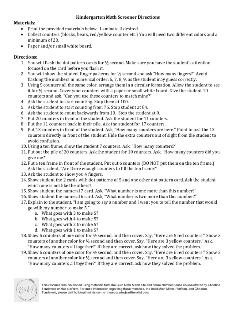 Get the free Kindergarten Math Screener Directions Materials: Print the ... - doe sd