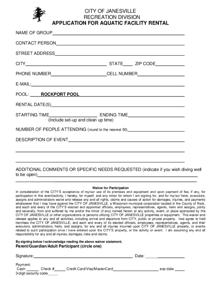 CITY OF JANESVILLE RECREATION DIVISION APPLICATION FOR AQUATIC FACILITY RENTAL NAME OF GROUP CONTACT PERSON STREET ADDRESS CITYSTATEPHONE NUMBER ZIP CORNELL NUMBEREMAIL: POOL:ROCKPORT PARENTAL DATE(S)