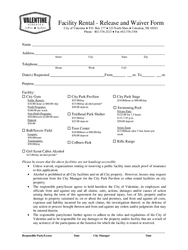 Facility Rental Release and Waiver Form City of Valentine P.O. Box 177 323 North Main Valentine, NE 69201 Phone: 4023762323 Fax 4023763301Name ___ Address___ StreetCityStateZipTelephone___ HomeWorkDate(s)