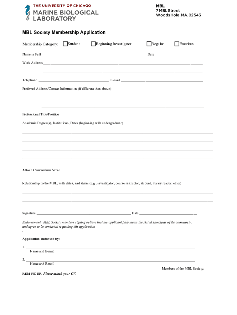 MBL 7 MBL Street Woods Hole, MA. 02543MBL Society Membership Application Membership Category:StudentBeginning InvestigatorRegularEmeritusName in Full ___ Date ___ Work Address ___ ___ Telephone ___