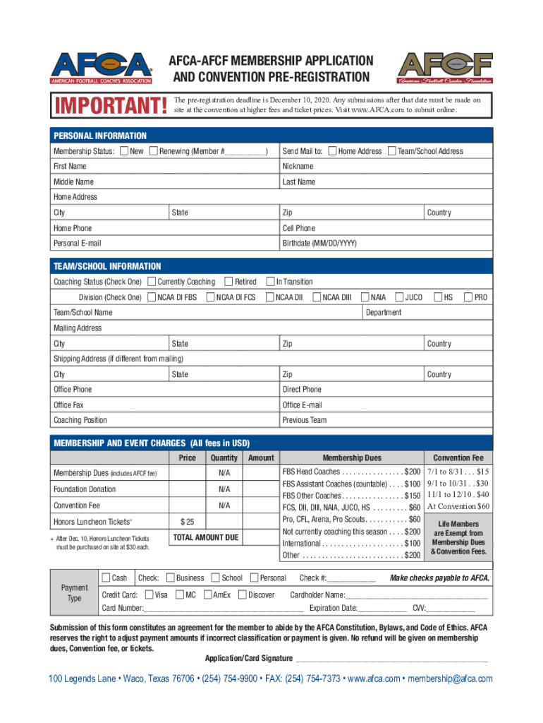 AFCAAFCF MEMBERSHIP APPLICATION AND CONVENTION PREREGISTRATIONIMPORTANT! The preregistration deadline is December 10, 2020. Any submissions after that date must be made on site at the convention at
