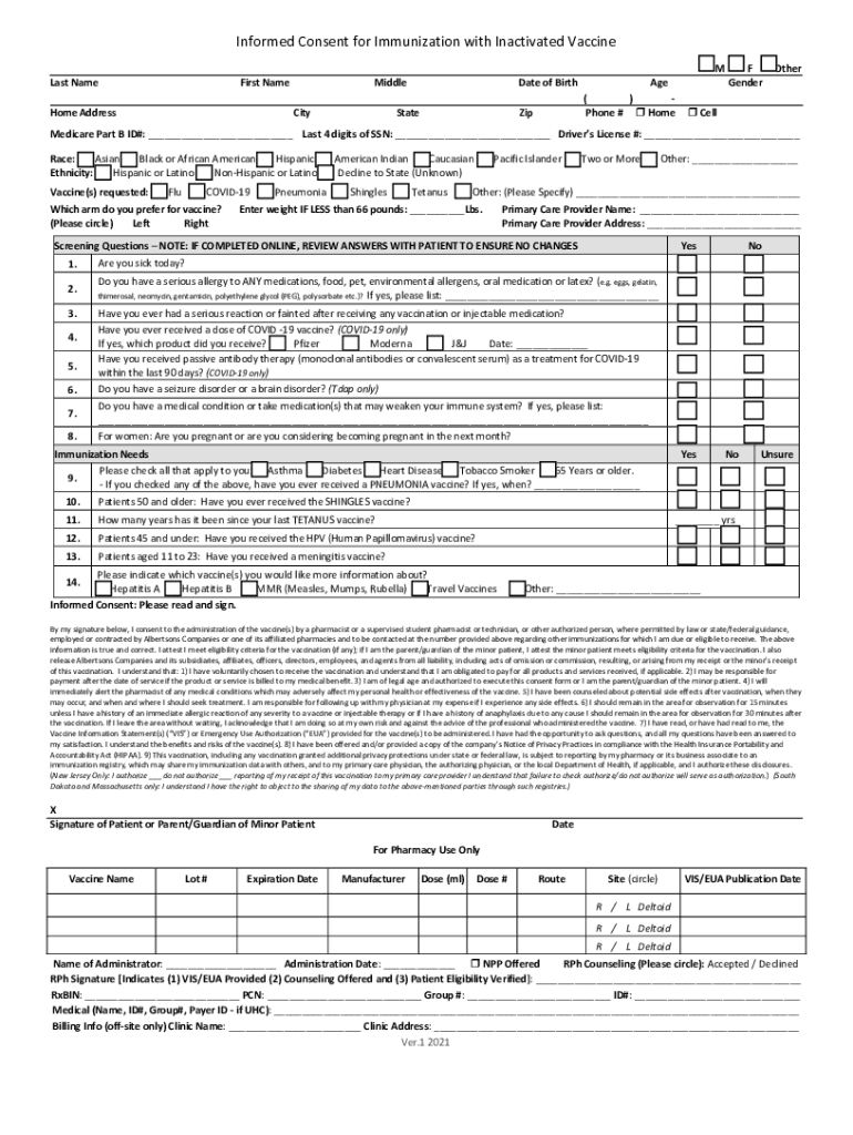 Informed Consent for Immunization with Inactivated Vaccine Last NameFirst NameMiddle Cathode Addressable of BirthStateZip M F Other Generate() Phone # Home Cell Medicare Part B ID#: ___ Last 4 digits