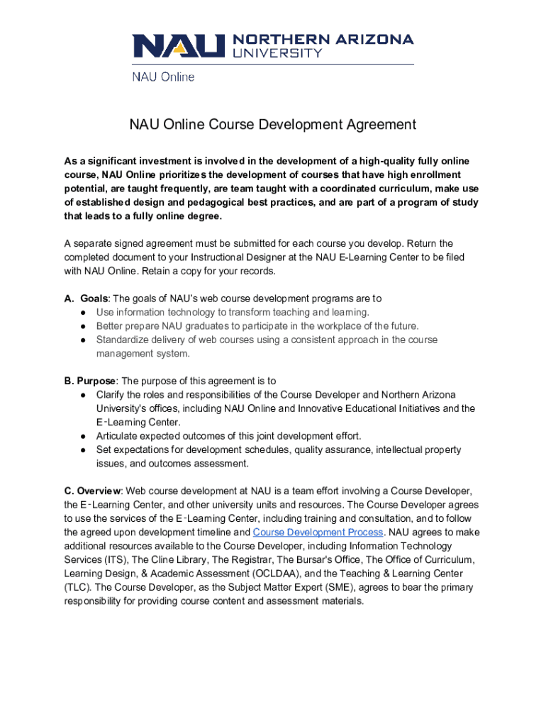 NAU Online Course Development Agreement As a significant investment is involved in the development of a high quality fully online course, NAU Online prioritizes the development of courses that have