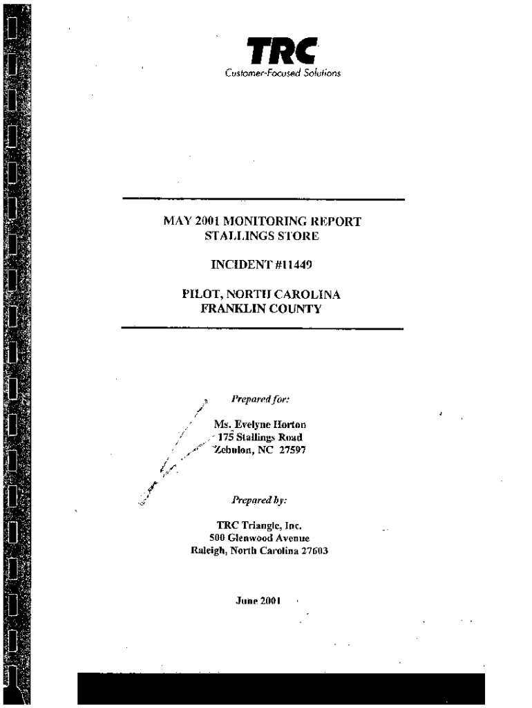 TACCustomerFocused Solutions 2001 MONITORING REPORT STALLING STORE INCIDENT #11449 PILOT, NORTH CAROLINA FRANKLIN COUNTY, n/ \'Prepared for:Ms. Evelyn Horton\' 17S Stalling Road Zebulon, NC 27597Prepared