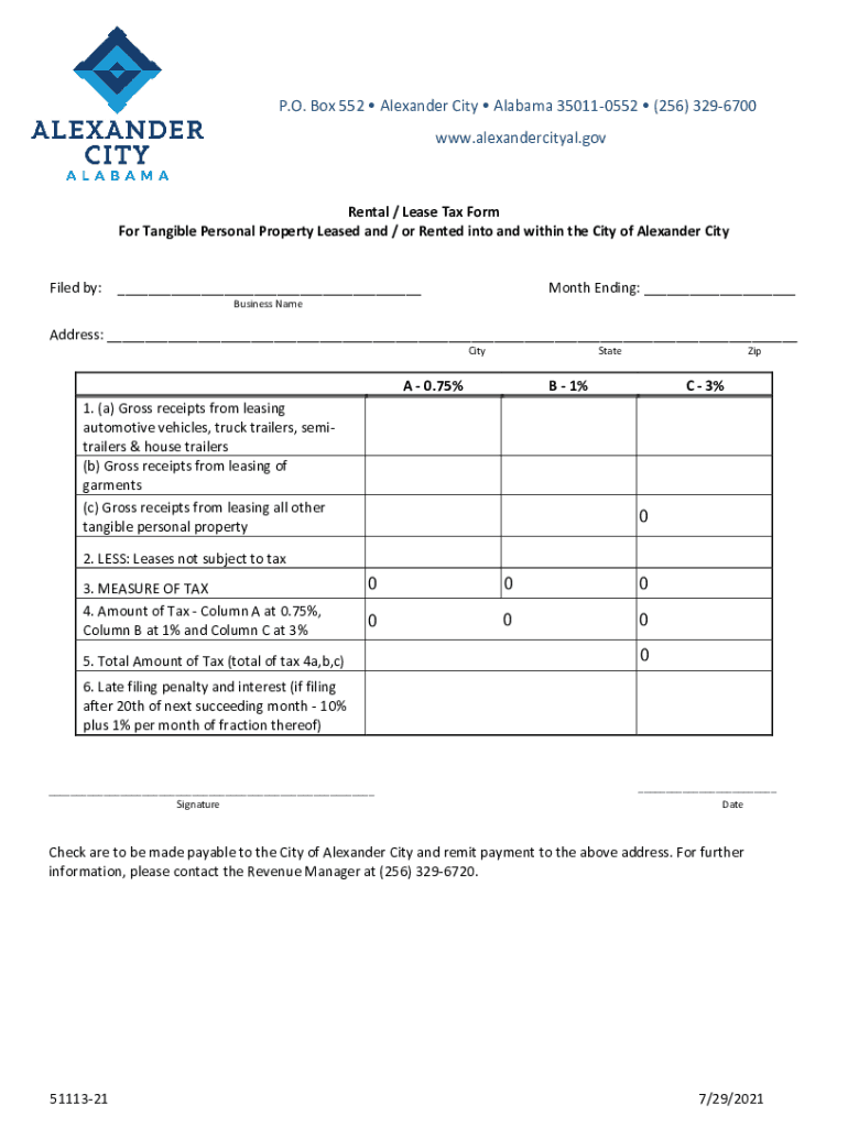 P.O. Box 552 Alexander City Alabama 350110552 (256) 3296700 www.alexandercityal.govRental / Lease Tax Form For Tangible Personal Property Leased and / or Rented into and within the City of Alexander