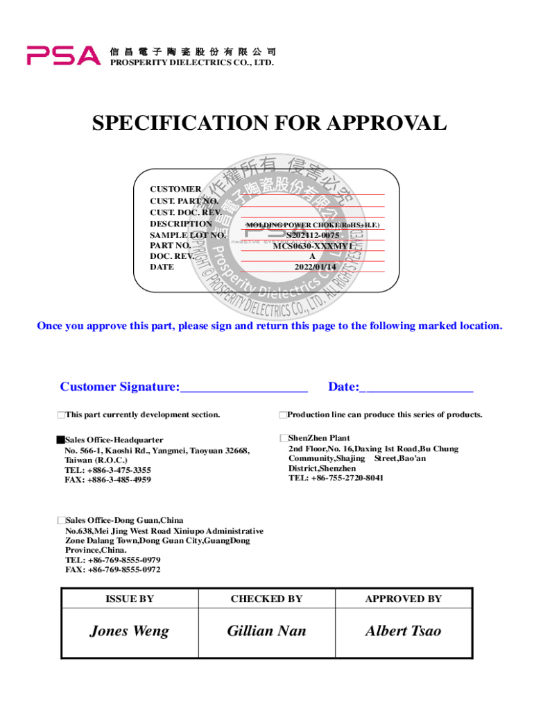 PROSPERITY DIELECTRICS CO., LTD.SPECIFICATION FOR APPROVAL CUSTOMER MUST. PART NO. MUST. DOC. REV. DESCRIPTION SAMPLE LOT NO. PART NO. DOC. REV. REMOLDING POWER CHOKE(Ross+H.F.) S2021120075 MCS0630XXXMY1