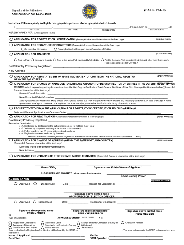 (BACK PAGE)Republic of the Philippines COMMISSION ON ELECTIONS Instruction: Filling completely and legibly the appropriate spaces and check appropriate choice/s in ovals. I, ___, ___ ___, Filipino,