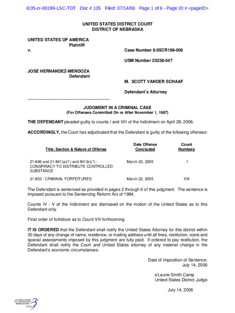 8:05cr00199LSCTDT Doc # 135 Filed: 07/14/06-Page 1 of 6-Page ID # paged UNITED STATES DISTRICT COURT DISTRICT OF NEBRASKA UNITED STATES OF AMERICA Plaintiff v. Case Number 8:05CR199006 US Number 20238047JOSE