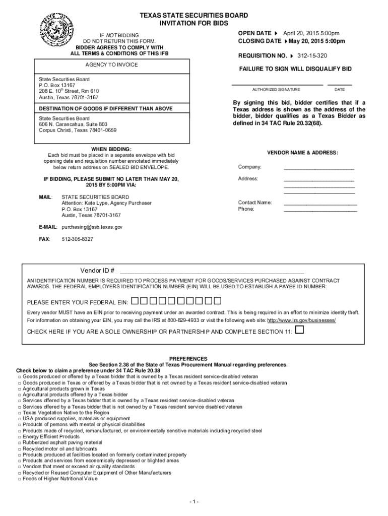 TEXAS STATE SECURITIES BOARD INVITATION FOR BIDS OPEN DATE April 20, 2015 5:00pm CLOSING DATE May 20, 2015 5:00pmIF NOT BIDDING DO NOT RETURN THIS FORM. BIDDER AGREES TO COMPLY WITH ALL TERMS & CONDITIONS