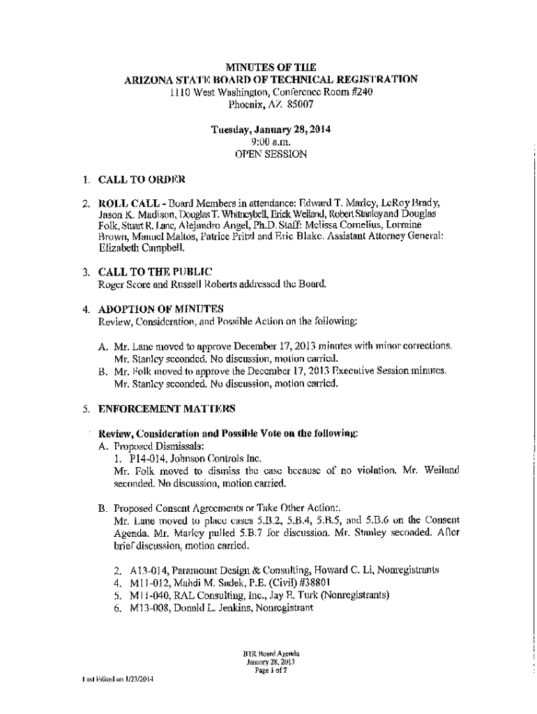 Get the free btr.az.govsitesdefaultMinutes ARIZONA STATE BOARD OF TECHNICAL REGISTRATION