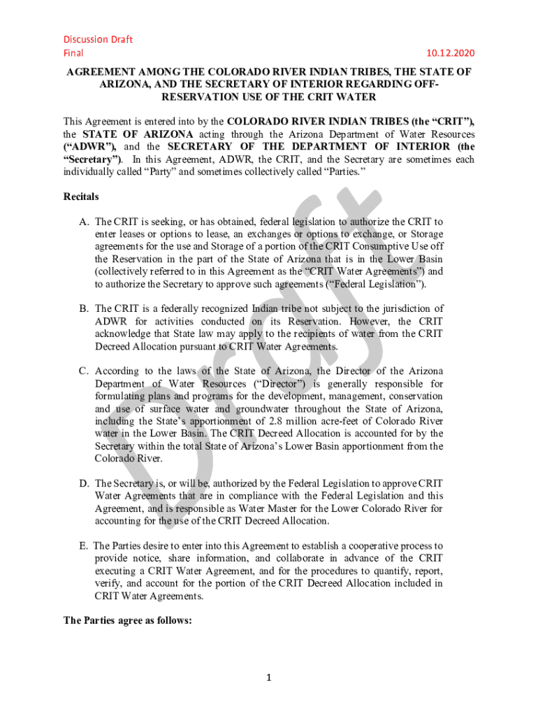Discussion Draft Final10.12.2020AGREEMENT AMONG THE COLORADO RIVER INDIAN TRIBES, THE STATE OF ARIZONA, AND THE SECRETARY OF INTERIOR REGARDING PRESERVATION USE OF THE CRT WATER This Agreement is