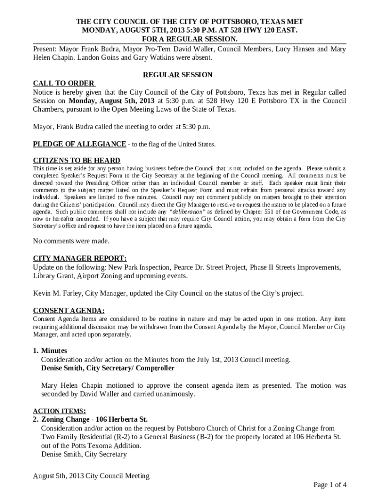 The www.pottsboro.govoffice2.comverticalsitesTHE CITY COUNCIL OF THE CITY OF POTTSBORO, TEXAS MET MONDAY ... is a Word document that can be filled-out and signed for certain purposes. Then, it is provided to the relevant addressee to provide specific info of certain kinds. The completion and signing is able manually in hard copy or using a trusted tool e. g. PDFfiller. Such tools help to complete any PDF or Word file online. It also lets you customize it for your needs and put a legal e-signature. Once finished, you send the www.pottsboro.govoffice2.comverticalsitesTHE CITY COUNCIL OF THE CITY OF POTTSBORO, TEXAS MET MONDAY ... to the recipient or several recipients by mail or fax. PDFfiller includes a feature and options that make your blank printable. It offers different settings when printing out. It does no matter how you will file a form after filling it out - in hard copy or by email - it will always look professional and organized. To not to create a new document from the beginning every time, make the original file as a template. Later, you will have a customizable sample.