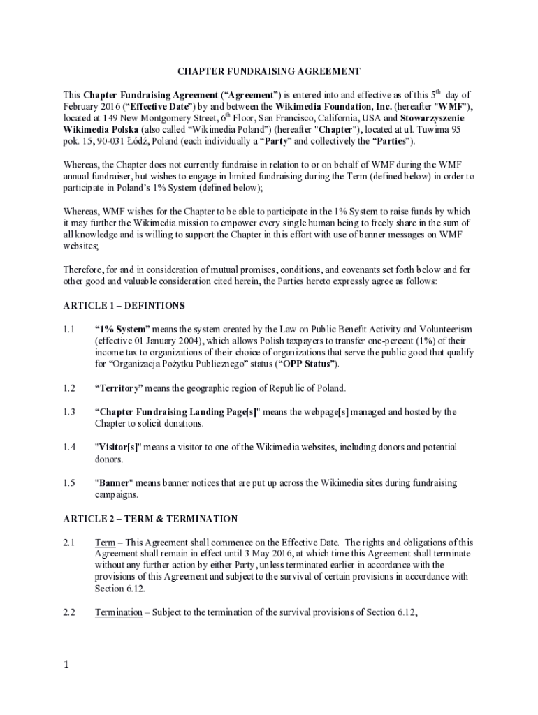 CHAPTER FUNDRAISING AGREEMENT This Chapter Fundraising Agreement (Agreement) is entered into and effective as of this 5th day of February 2016 (Effective Date) by and between the Wikimedia Foundation,