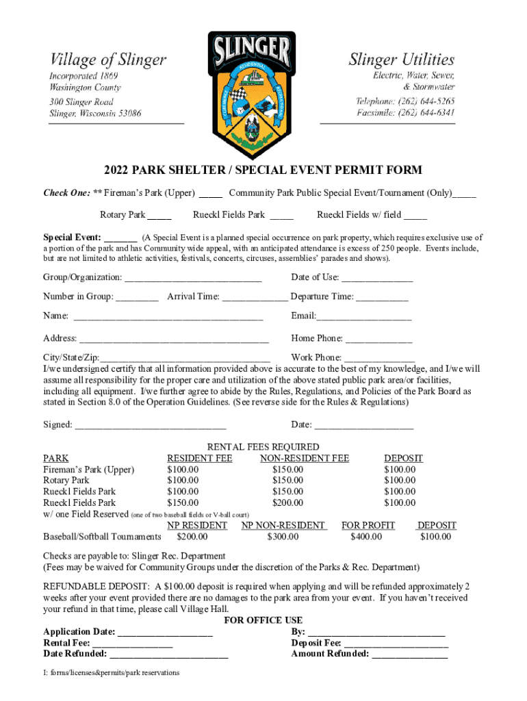 2022 PARK SHELTER / SPECIAL EVENT PERMIT FORM Check One: ** Fireman Park (Upper) ___ Community Park Public Special Event/Tournament (Only)___ Rotary Park ___Ruck Fields Park ___Ruck Fields w/ field