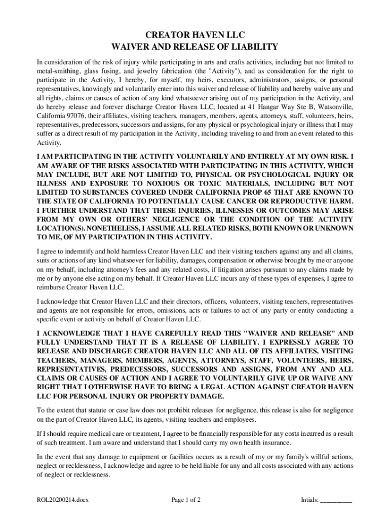 CREATOR HAVEN LLC WAIVER AND RELEASE OF LIABILITY In consideration of the risk of injury while participating in arts and crafts activities, including but not limited to metalsmithing, glass fusing,