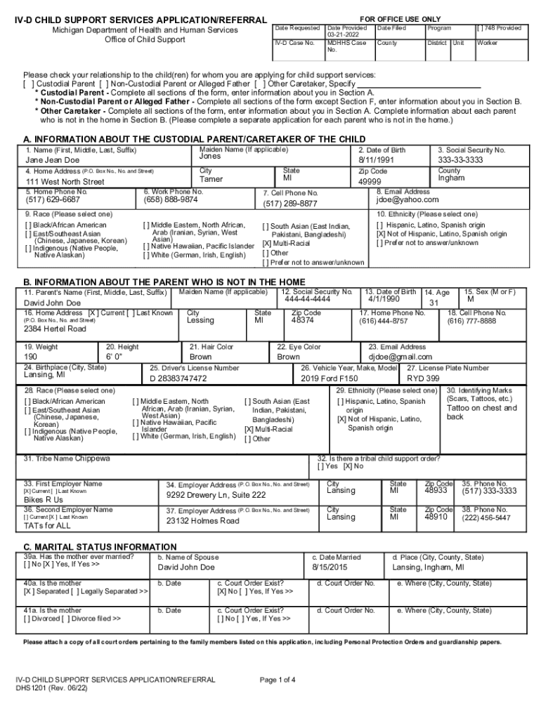IVD CHILD SUPPORT SERVICES APPLICATION/REFERRAL Michigan Department of Health and Human Services Office of Child Supportive Requested IVD Case No. FOR OFFICE USE Validate Provided 03212022 MD HHS