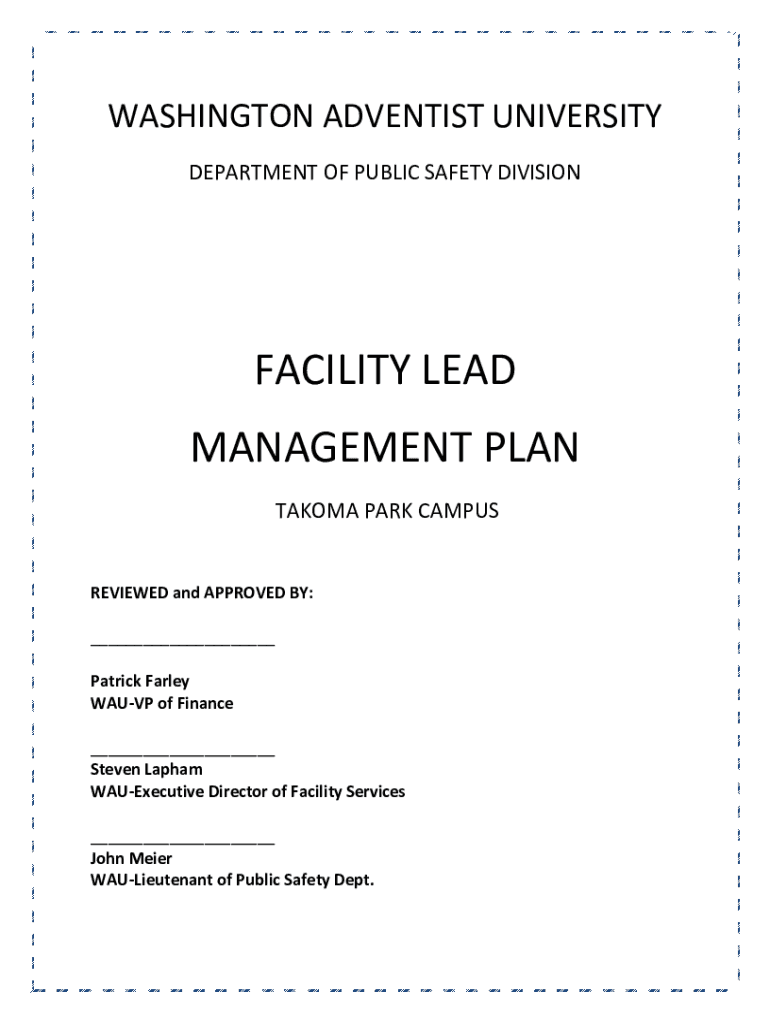 WASHINGTON ADVENTIST UNIVERSITY DEPARTMENT OF PUBLIC SAFETY DIVISIONFACILITY LEAD MANAGEMENT PLAN TACOMA PARK CAMPUSREVIEWED and APPROVED BY: ___ Patrick Farley WAVE of Finance ___ Steven Latham Executive