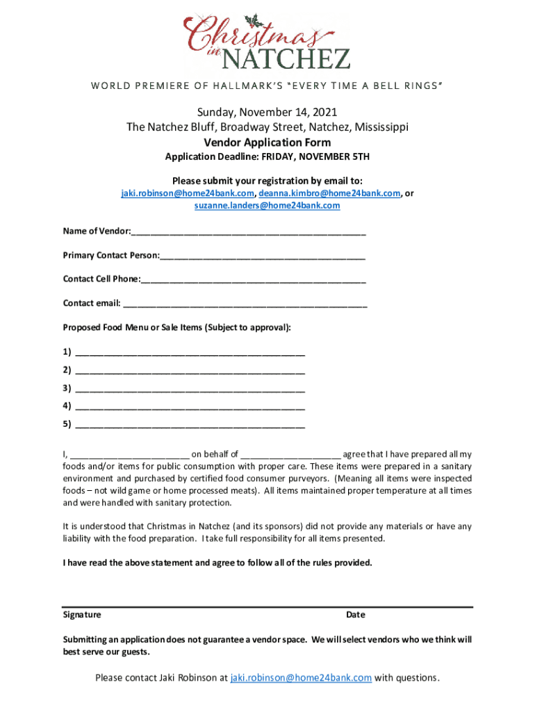 WORLD PREMIERE OF HALLMARKS EVERY TIME A BELL RINGS Sunday, November 14, 2021, The Natchez Bluff, downtown Natchez, Mississippi Vendor Information Application Deadline: FRIDAY, NOVEMBER 5TH Expected
