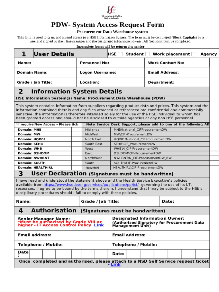 Procurement data warehouse access request . This is used to grant and amend access to a Health Service Executive (HSE) ination system template instructions