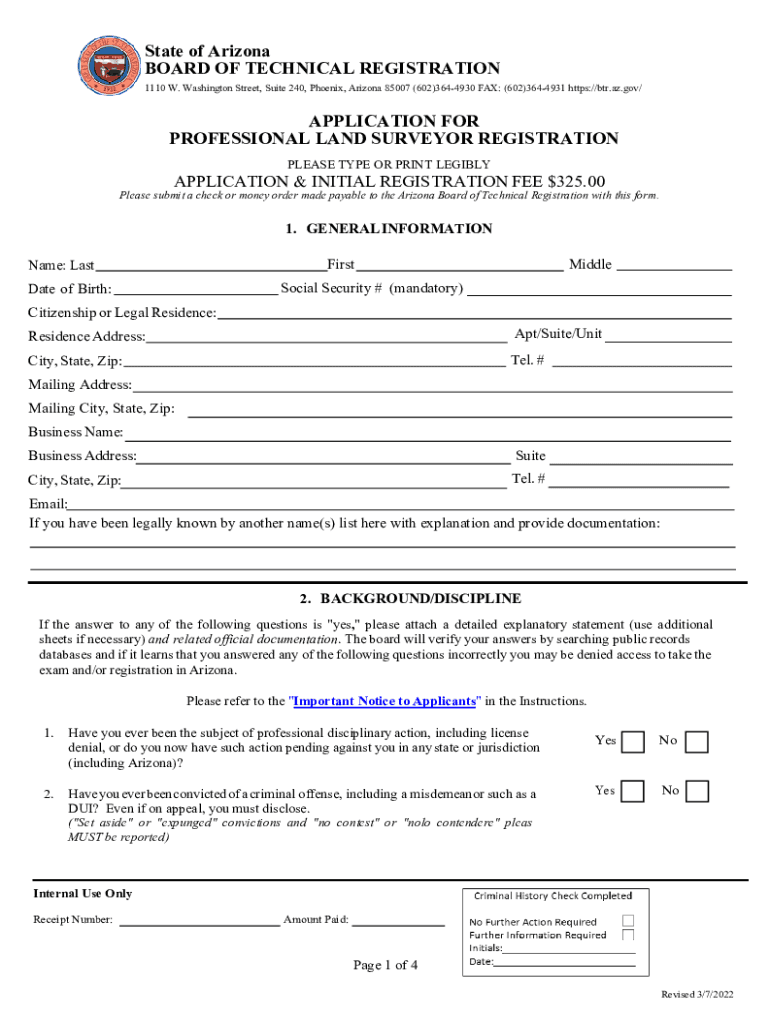 LAND SURVEYOR INSTRUCTIONS FOR COMPLETING AN APPLICATION FOR PROFESSIONAL REGISTRATION KNOWINGLY MAKING A FALSE STATEMENT IN CONNECTION WITH YOUR APPLICATION MAY Because FOR DENIAL OF YOUR APPLICATION