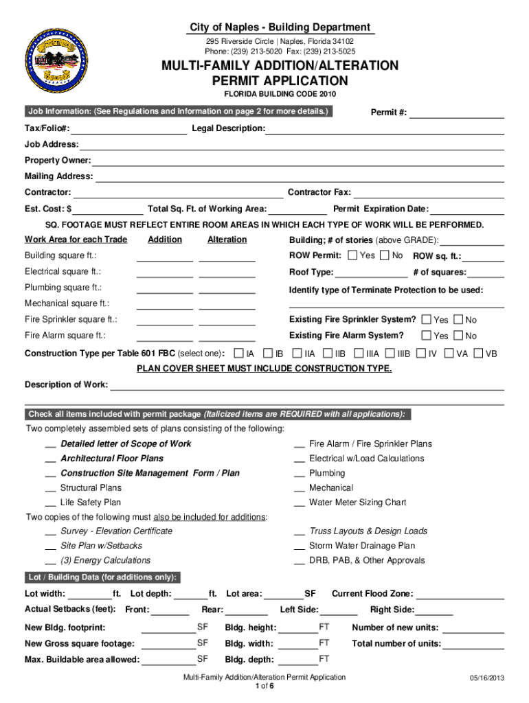 City of Naples Building Department 295 Riverside Circle | Naples, Florida 34102 Phone: (239) 2135020 Fax: (239) 2135025MULTIFAMILY ADDITION/ALTERATION PERMIT APPLICATION FLORIDA BUILDING CODE 2010Job