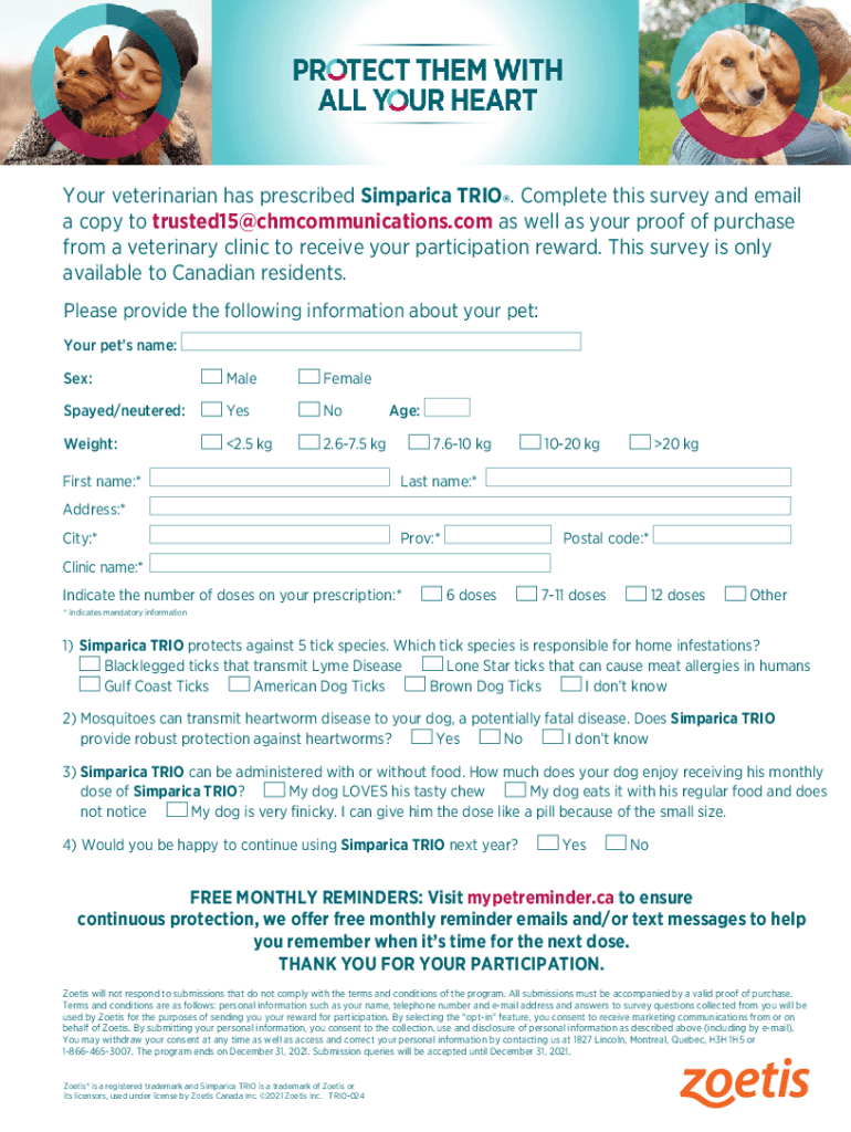 Your veterinarian has prescribed Simpatico TRIO. Complete this survey and email a copy to trusted15@chmcommunications.com as well as your proof of purchase from a veterinary clinic to receive your