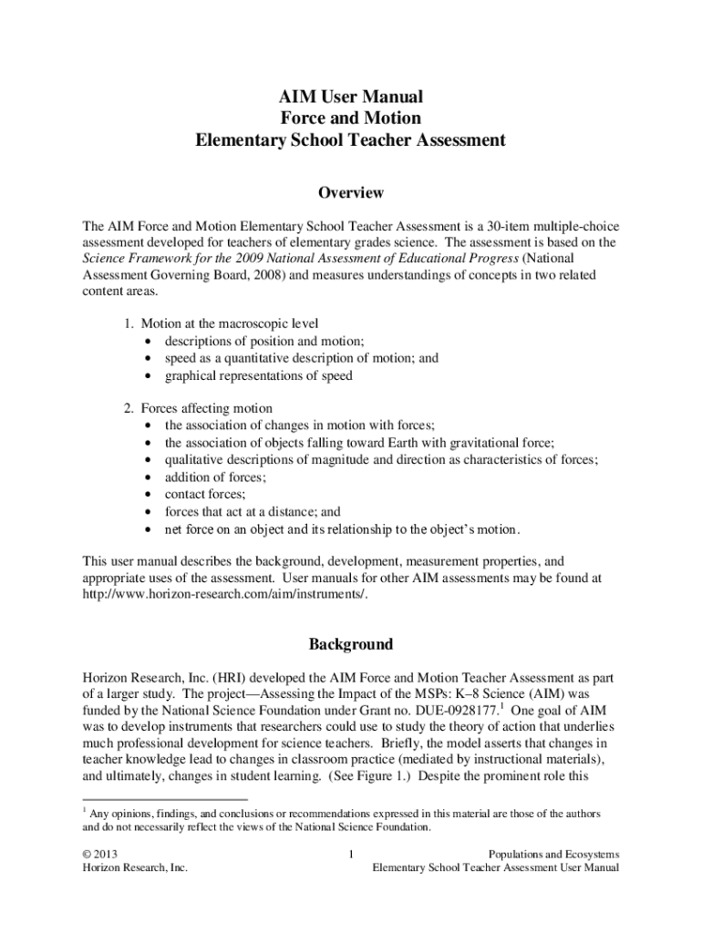 AIM User Manual Force and Motion Elementary School Teacher Assessment Overview The AIM Force and Motion Elementary School Teacher Assessment is a 30item multiple choice assessment developed for teachers