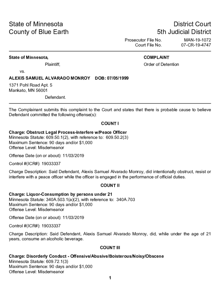 StateofMinnesota CountyofBlueEarthDistrictCourt 5thJudicialDistrict ProsecutorFileNo. CourtFileNo. StateofMinnesota,MAN191072 07CR194747COMPLAINTPlaintiff,OrderofDetentionvs. ALEXISSAMUELALVARADOMONROYDOB:07/05/1999