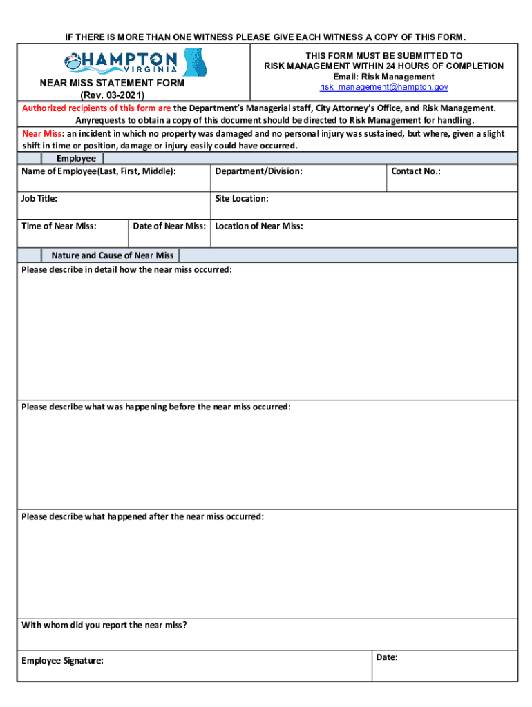 Get the free NEAR MISS STATEMENT FORM (Rev. 03-2021) Authorized ...