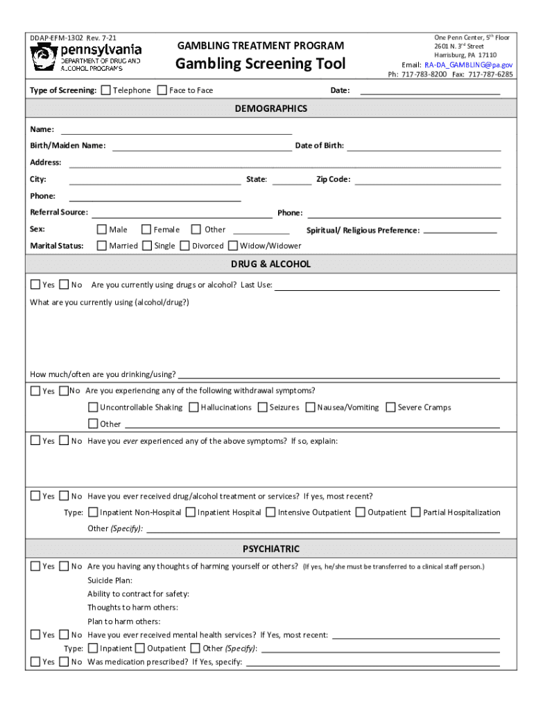 DDAPEFM1302 Rev. 721One Penn Center, 5th Floor 2601 N. 3rd Street Harrisburg, PA 17110GAMBLING TREATMENT PROGRAMGambling Screening Tool Type of Screening:TelephoneEmail: RADA_GAMBLING@pa.gov pH: 7177838200