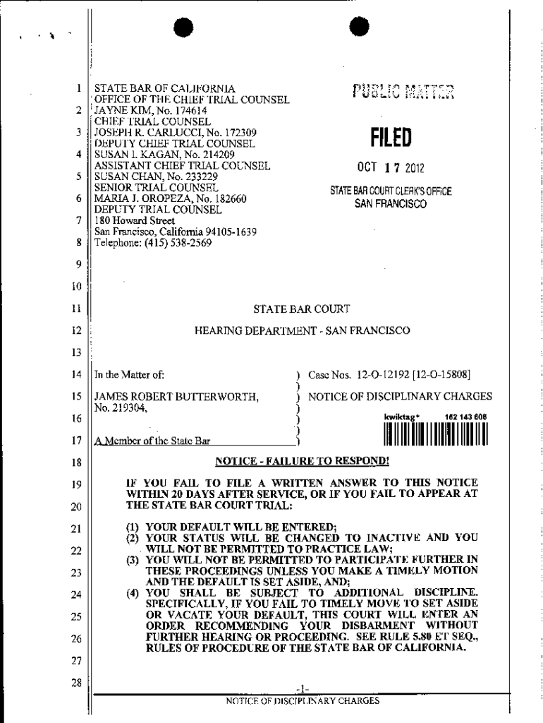 1 2 3 4 5 6 7 8STATE BAR OF CALIFORNIA OFFICE OF THE CHIEF TRIAL COUNSEL JAYNE KIM, No. 174614 CHIEF TRIAL COUNSEL JOSEPH R. GALLUCCI, No. 172309 DEPUTY CHIEF TRIAL COUNSEL SUSAN I. KAGAN, No. 214209