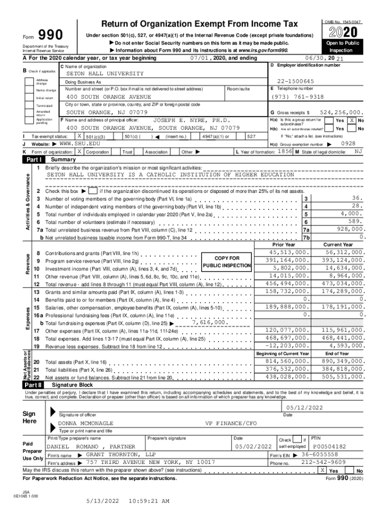 Income, expenses, assets, liabilities, and other financial details related to transactions with Seton Hall University.