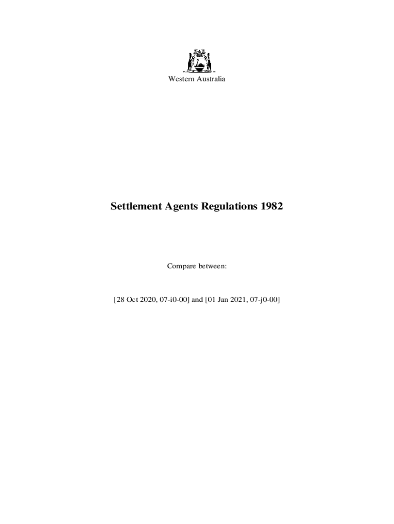 Western AustraliaSettlement Agents Regulations 1982Compare between:[28 Oct 2020, 07i000] and [01 Jan 2021, 07j000]Settlement Agents Act 1981Settlement Agents Regulations 1982 1. Citation These regulations