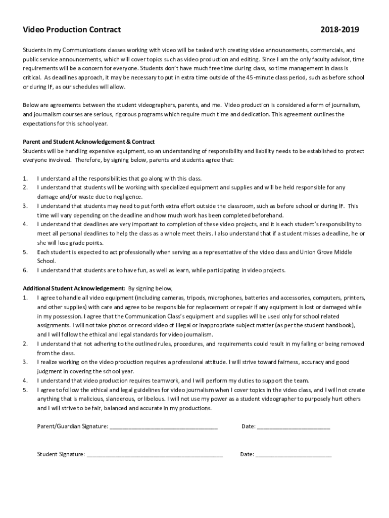 Video Production Contract20182019Students in my Communications classes working with video will be tasked with creating video announcements, commercials, and public service announcements, which will