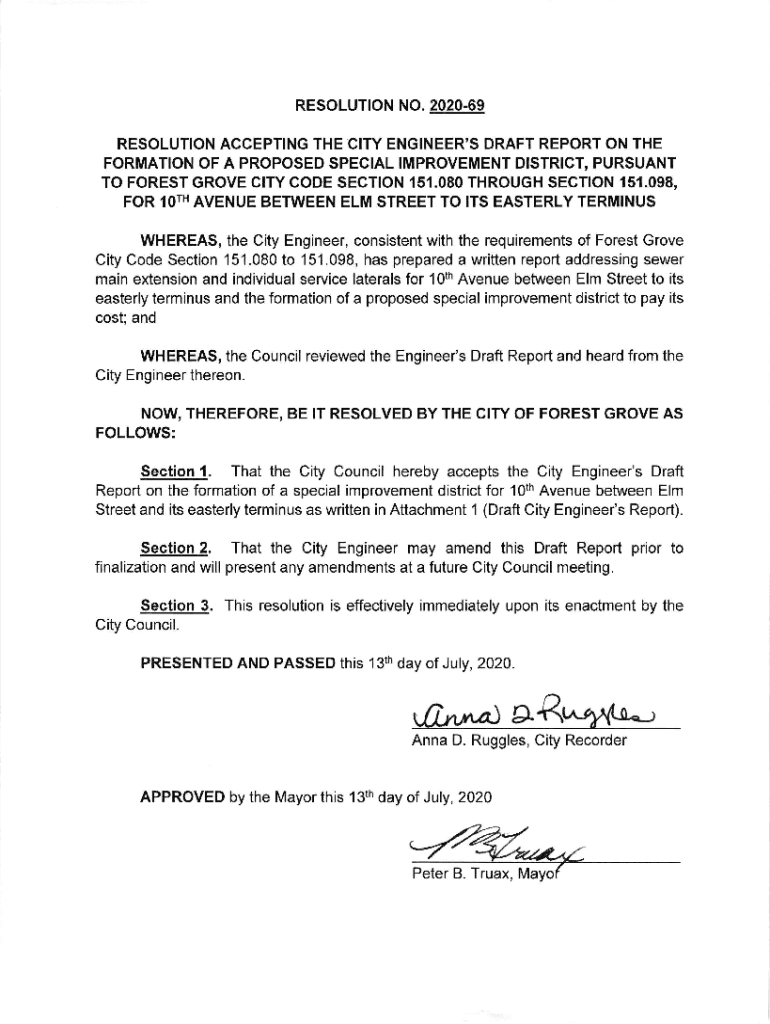 RESOLUTION NO. 202069 RESOLUTION ACCEPTING THE CITY ENGINEER\'S DRAFT REPORT ON THE FORMATION OF A PROPOSED SPECIAL IMPROVEMENT DISTRICT, PURSUANT TO FOREST GROVE CITY CODE SECTION 151.080 THROUGH